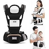 Ergonomic Baby Carrier with Detachable Hip Seat and Head Support, 6 in 1 Ergonomic Baby Carrier M-Shape Design for Newborn to Toddler, Adjustable Shoulder Strap, Bottle Holder & Storage Pocket - Black